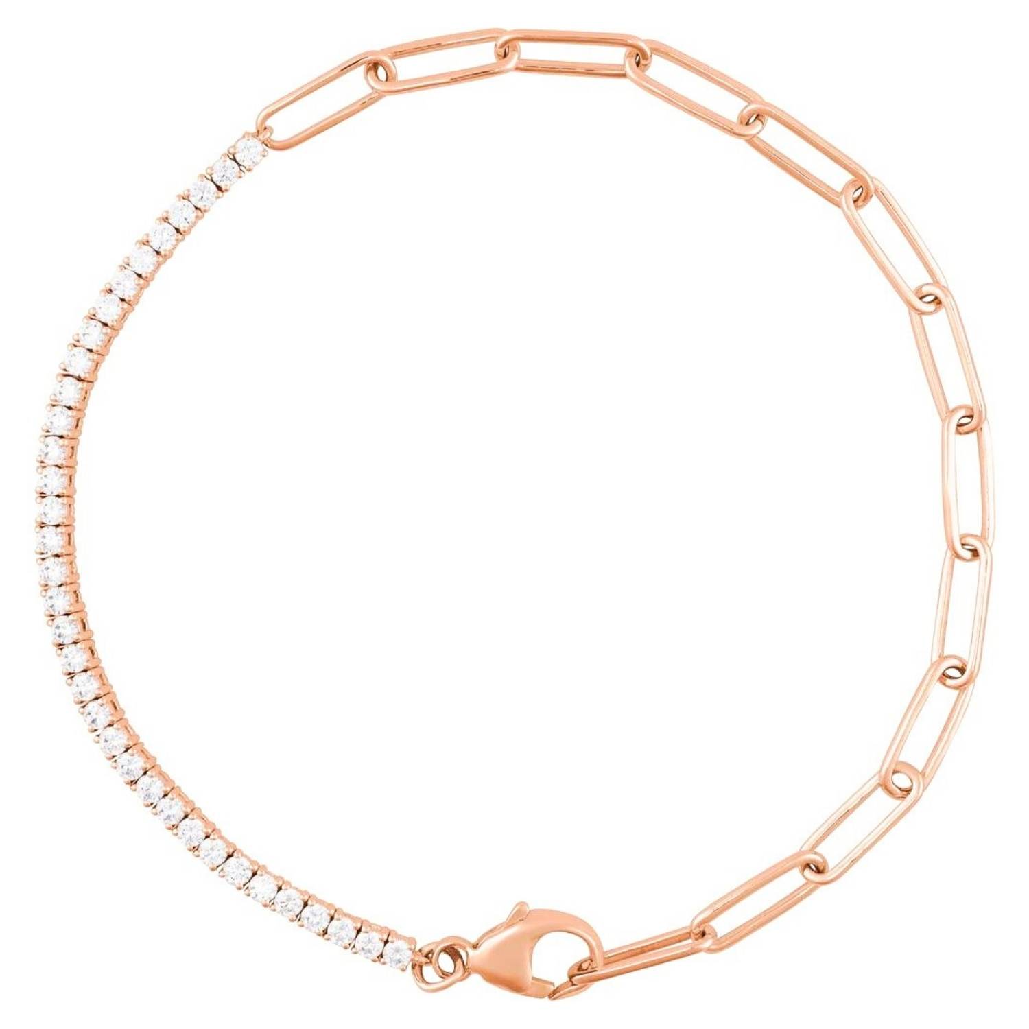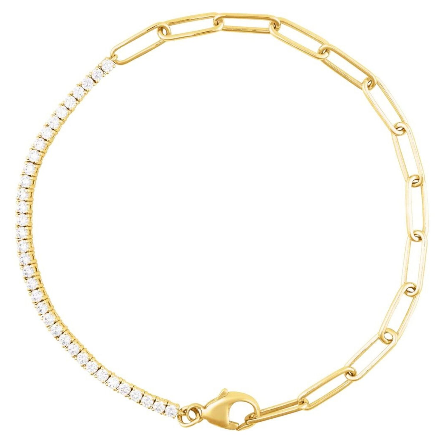 This bracelet combines the modern look of a paperclip chain with the classic sparkle of a diamond tennis design in one piece. It offers an elegant look on its own, while creating a striking layered style when worn alongside other gold or diamond bracelets.