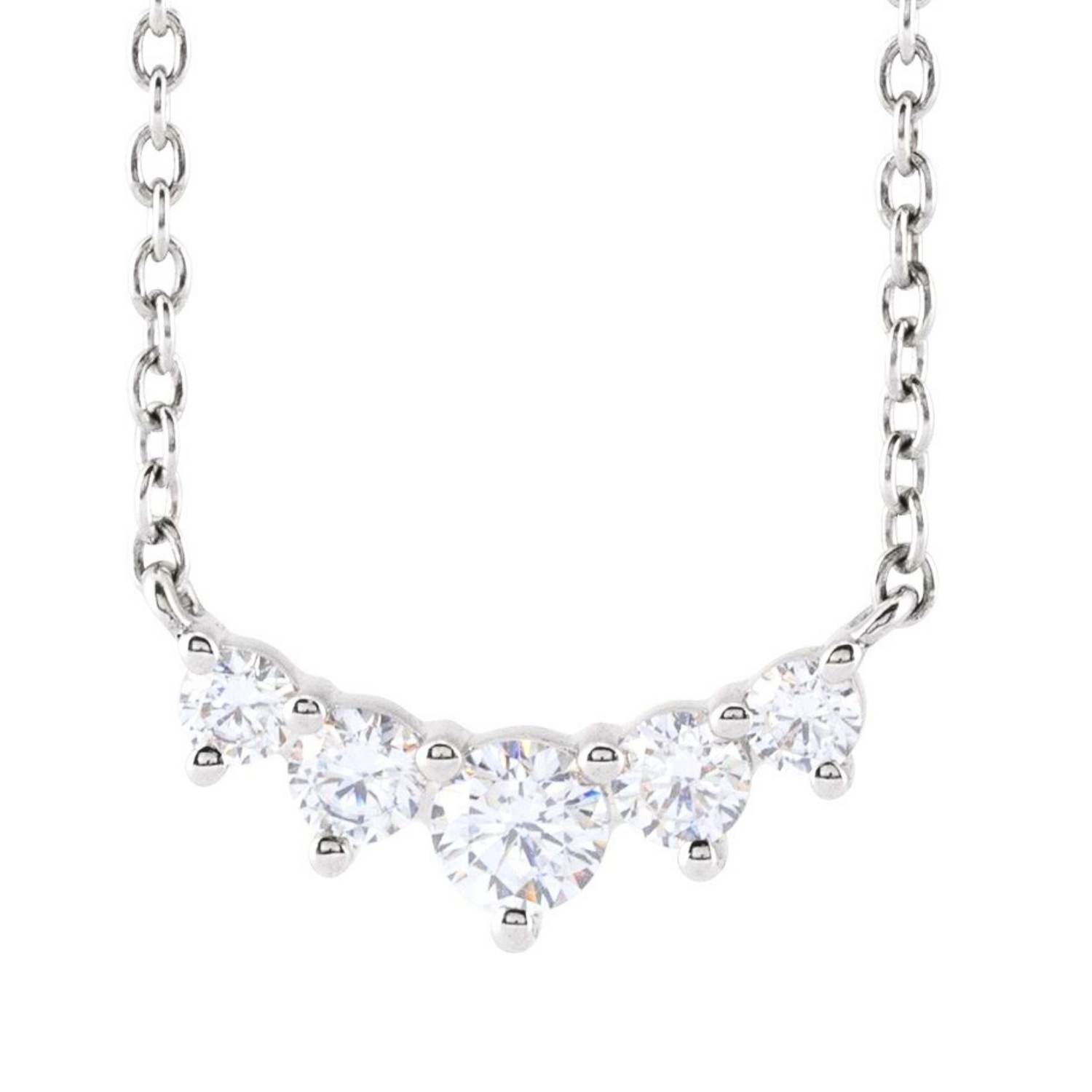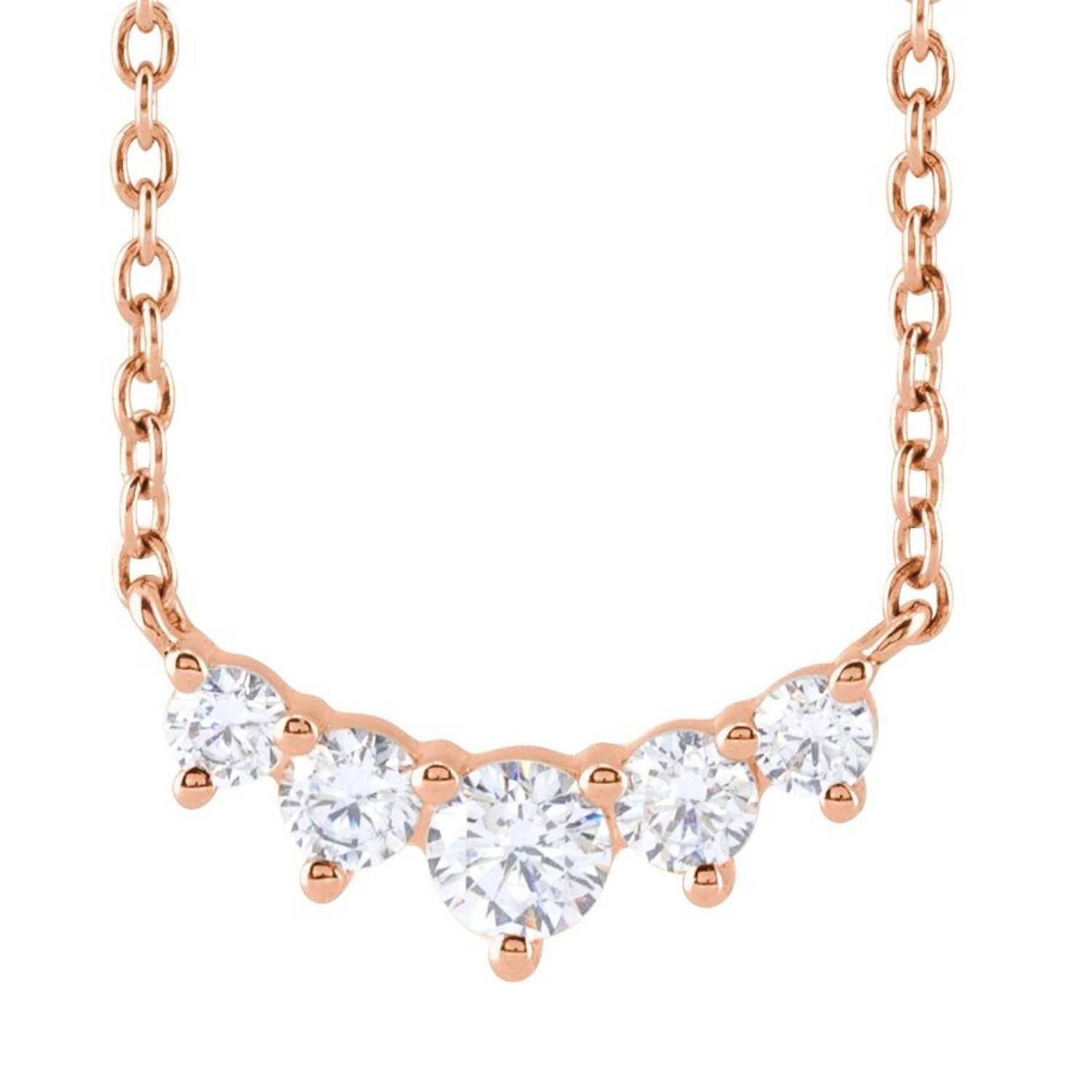 he modern interpretation of elegance comes to life in this 14k gold horizontal graduated five-stone diamond necklace. Each carefully placed lab-grown round diamond creates an elegant transition along the neckline. This “graduated” design, featuring a larger center stone, captures light from different angles to deliver a sophisticated sparkle. Simple yet eye-catching for everyday wear, it stands out as a chic and luxury fine jewelry piece for special occasions.