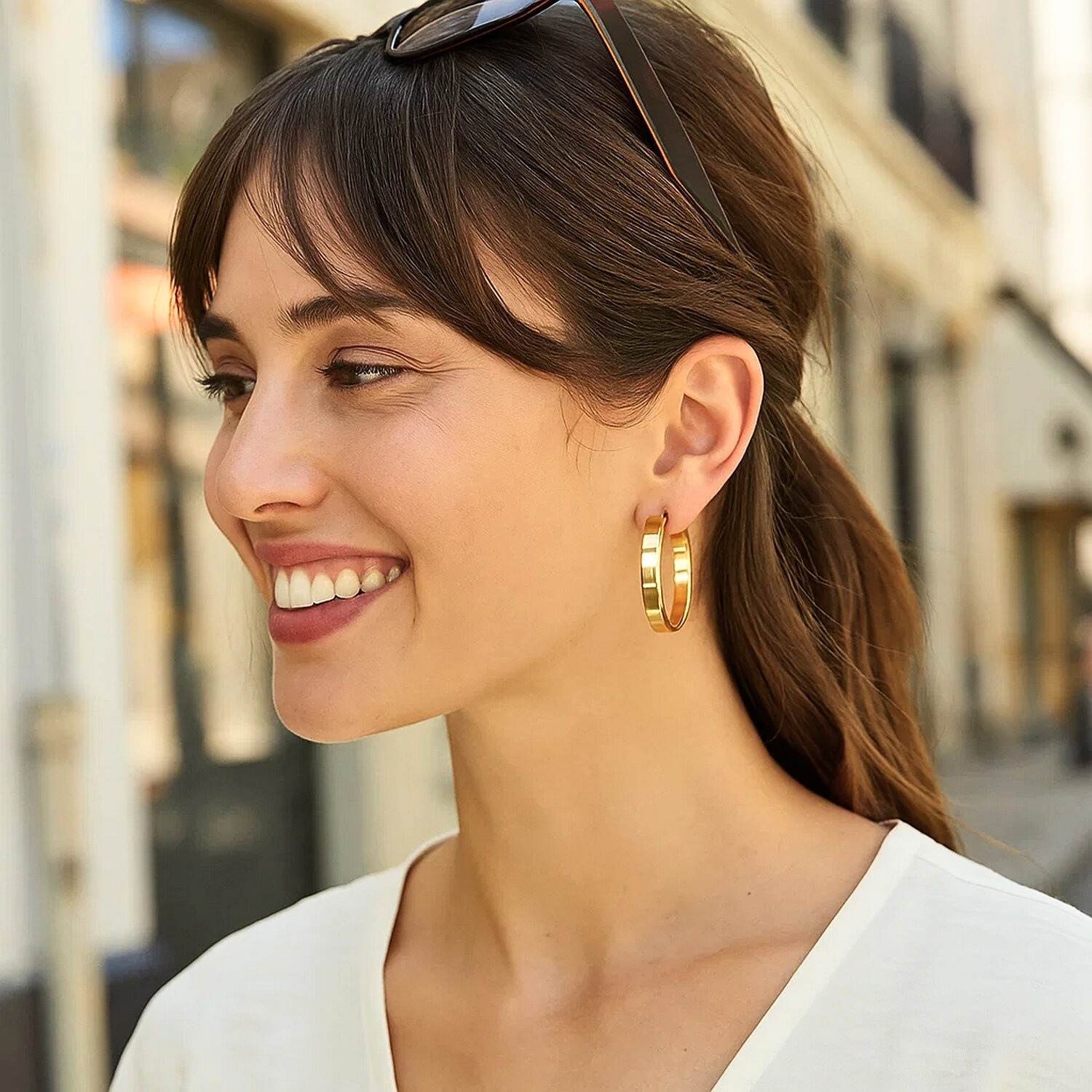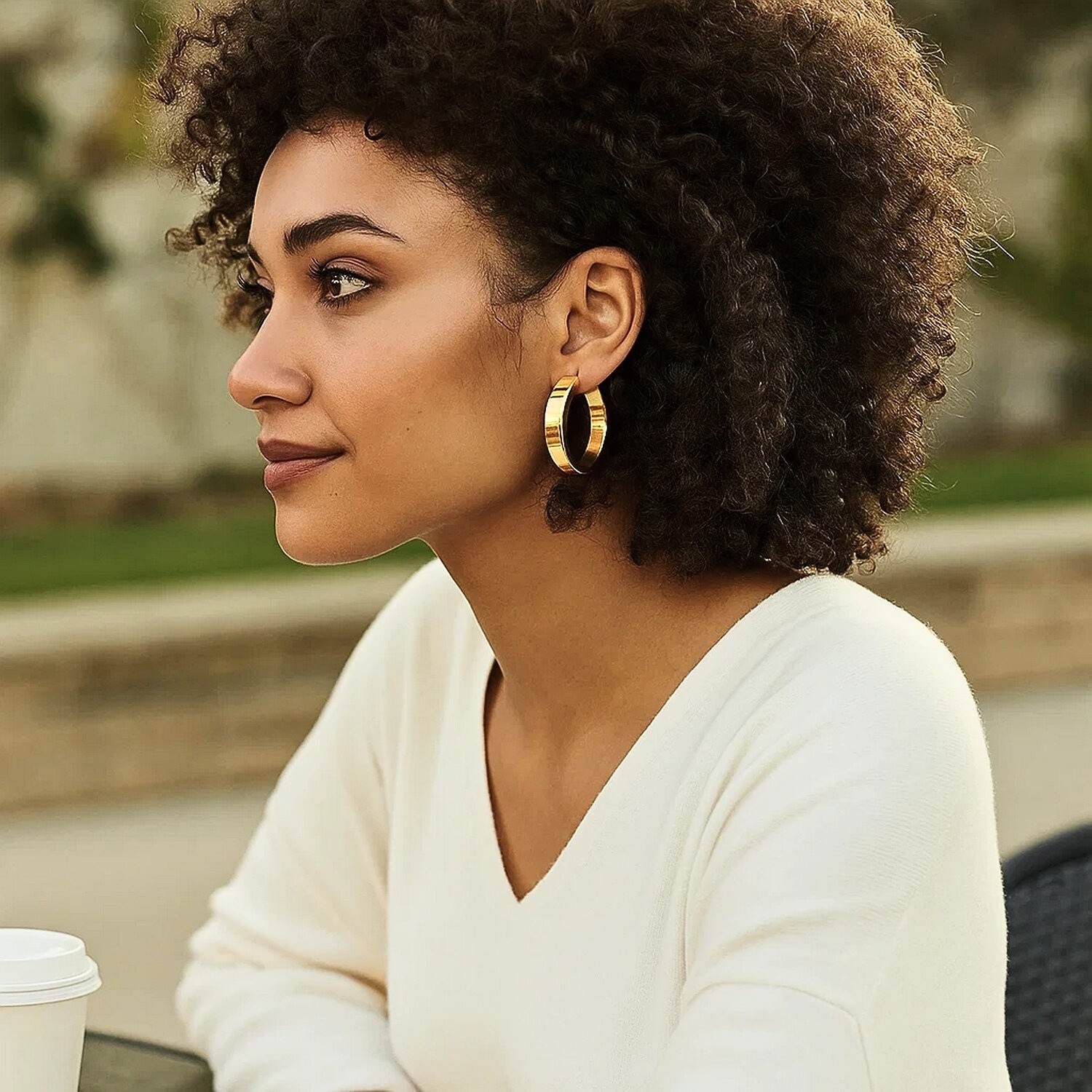 14K Yellow Gold Large Thick Tube Hoop Earrings feature a bold, elegant design with a large, substantial tube shape. Crafted from genuine 14K yellow gold, the thick tube structure in a square form reflects light across its wide surface, creating a striking brilliance. They are crafted with fine jewelry quality. They do not tarnish, are nickel-free, and are suitable for sensitive skin.