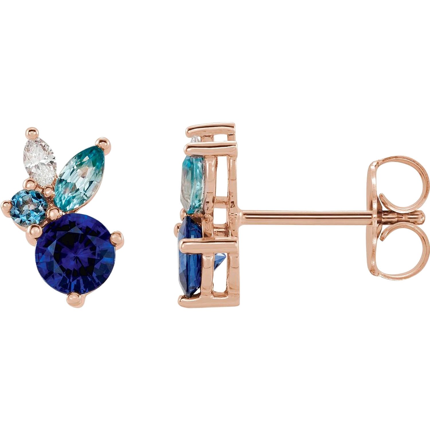 14K Gold Natural Aquamarine, Sky Blue Topaz, Blue Sapphire and Diamond Cluster Stud Earrings