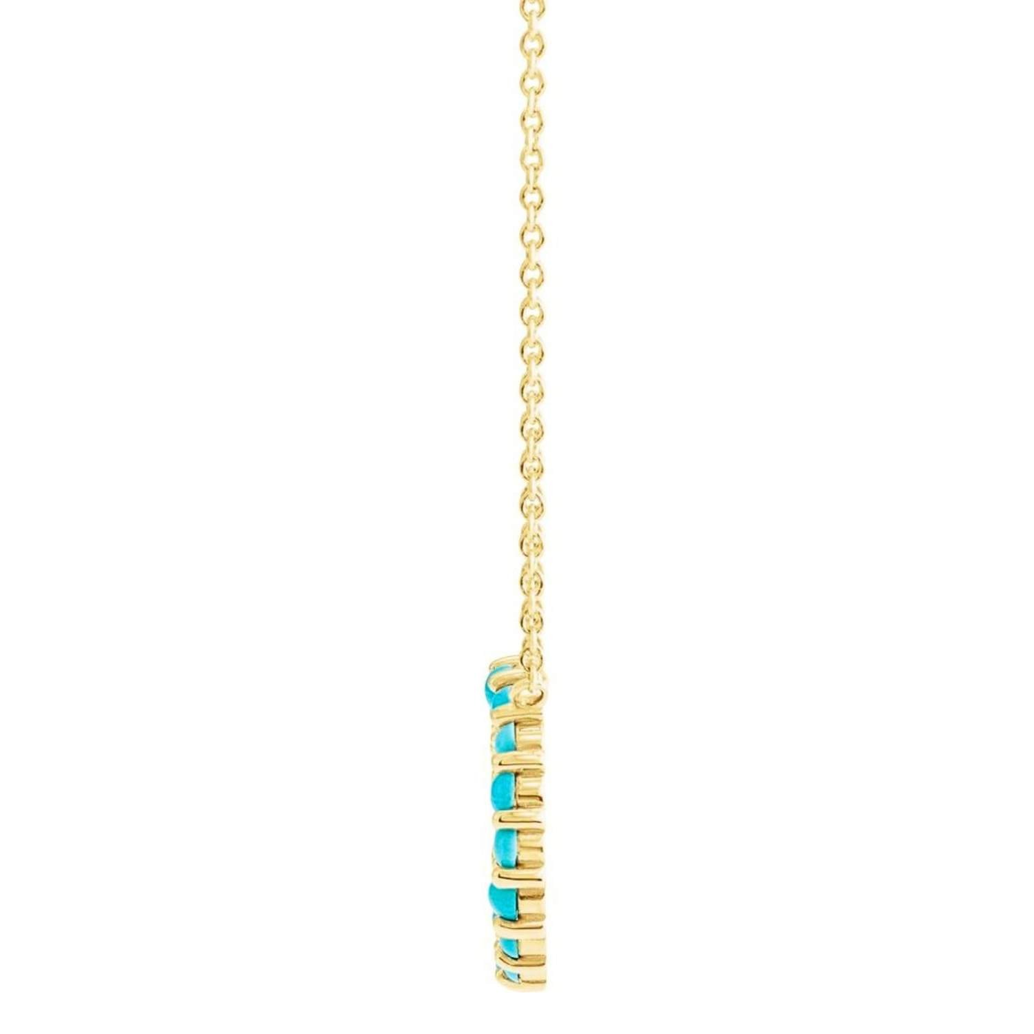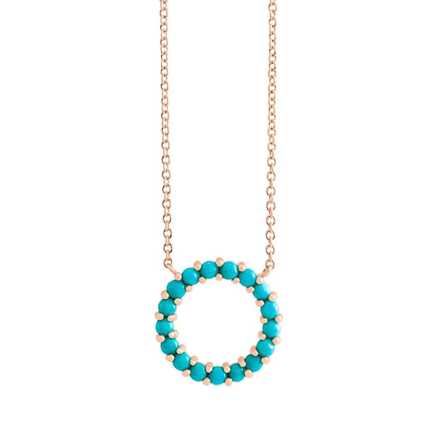 This 14K gold natural turquoise circle necklace is an elegant piece of jewelry designed for women. The circular pendant is adorned with vibrant blue turquoise stones set along its edges. Turquoise is the birthstone for December and adds energy to the piece. It adds a natural and stylish touch to your jewelry collection for everyday wear or special occasions.