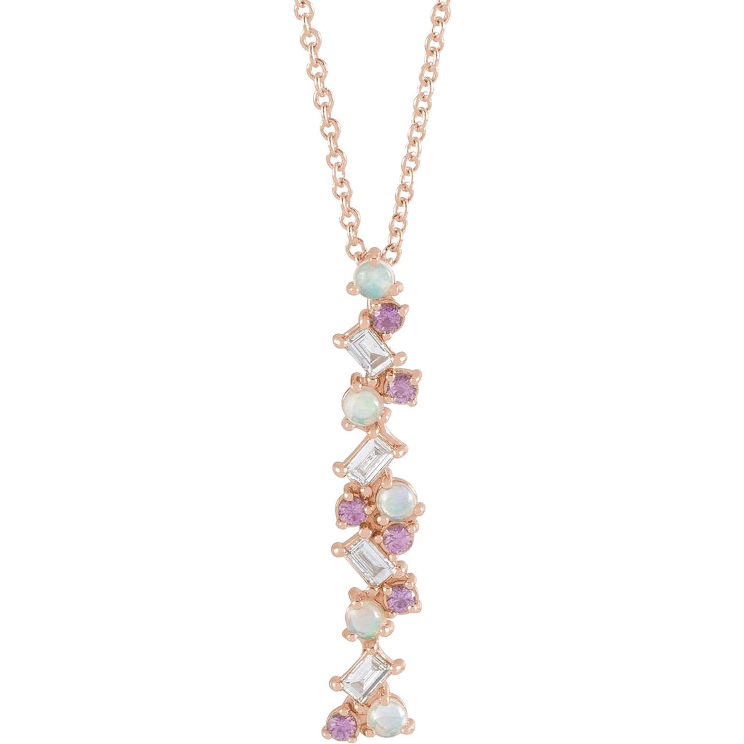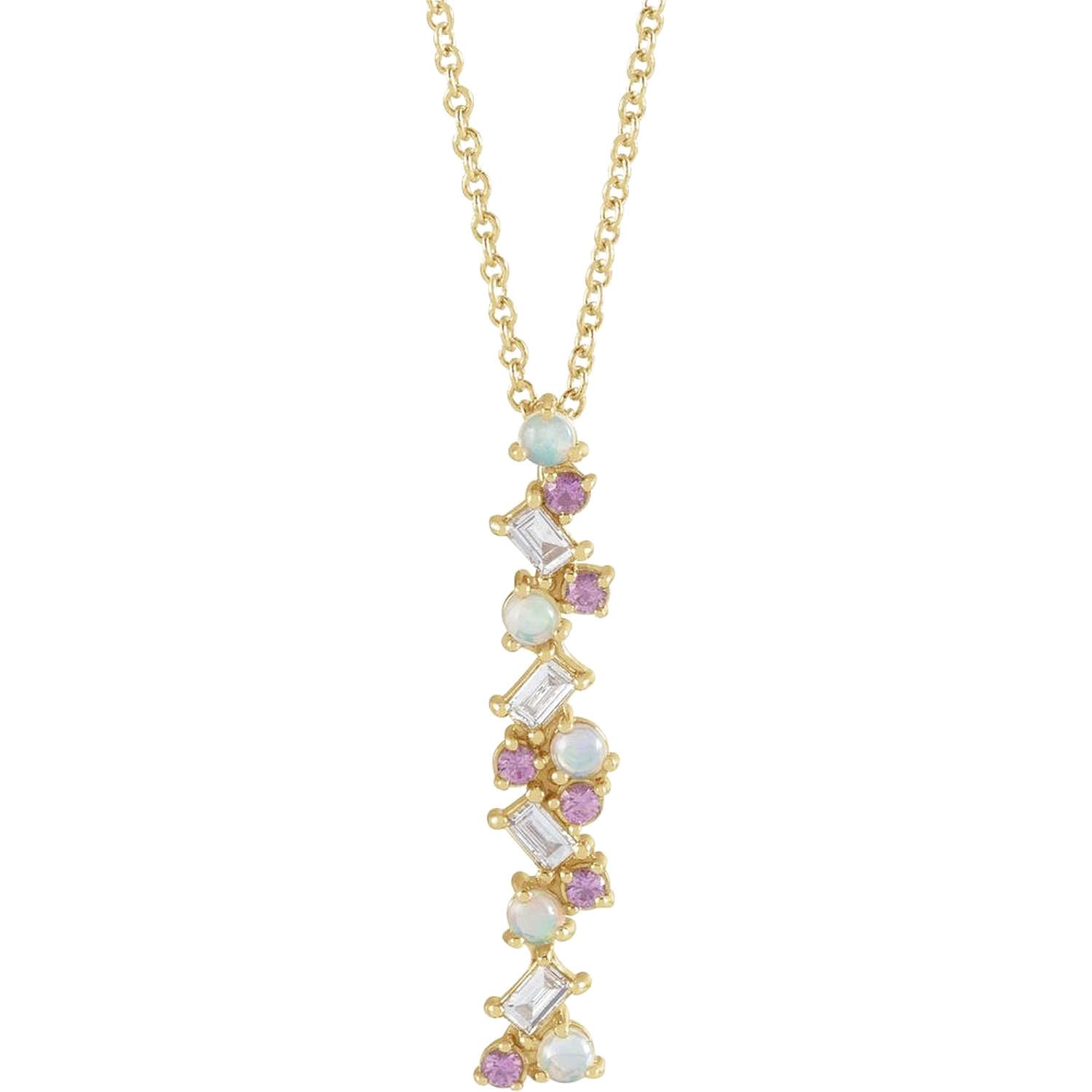 This necklace, featuring a scattered bar design, offers a chic accessory option for everyday wear or special occasions with its natural opal, pink sapphire, and diamond stones. Order online to take advantage of free shipping and special discounts.