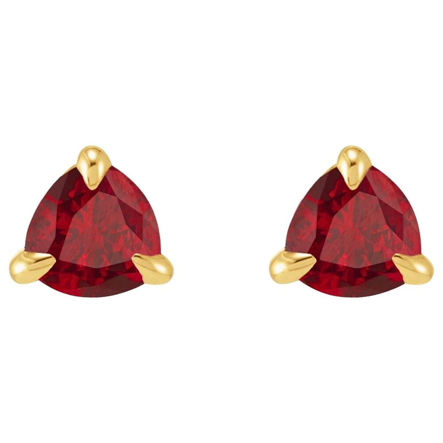 Designed for women, these 14K Gold Real Trillion Cut Ruby Stud Earrings feature a stylish claw-prong design that highlights the vibrant red tones of natural ruby. The trillion cut ensures the stone reflects light evenly. Ruby, the birthstone for July, symbolizes luck and energy; it offers simple elegance for everyday wear while being a striking detail for special occasions.