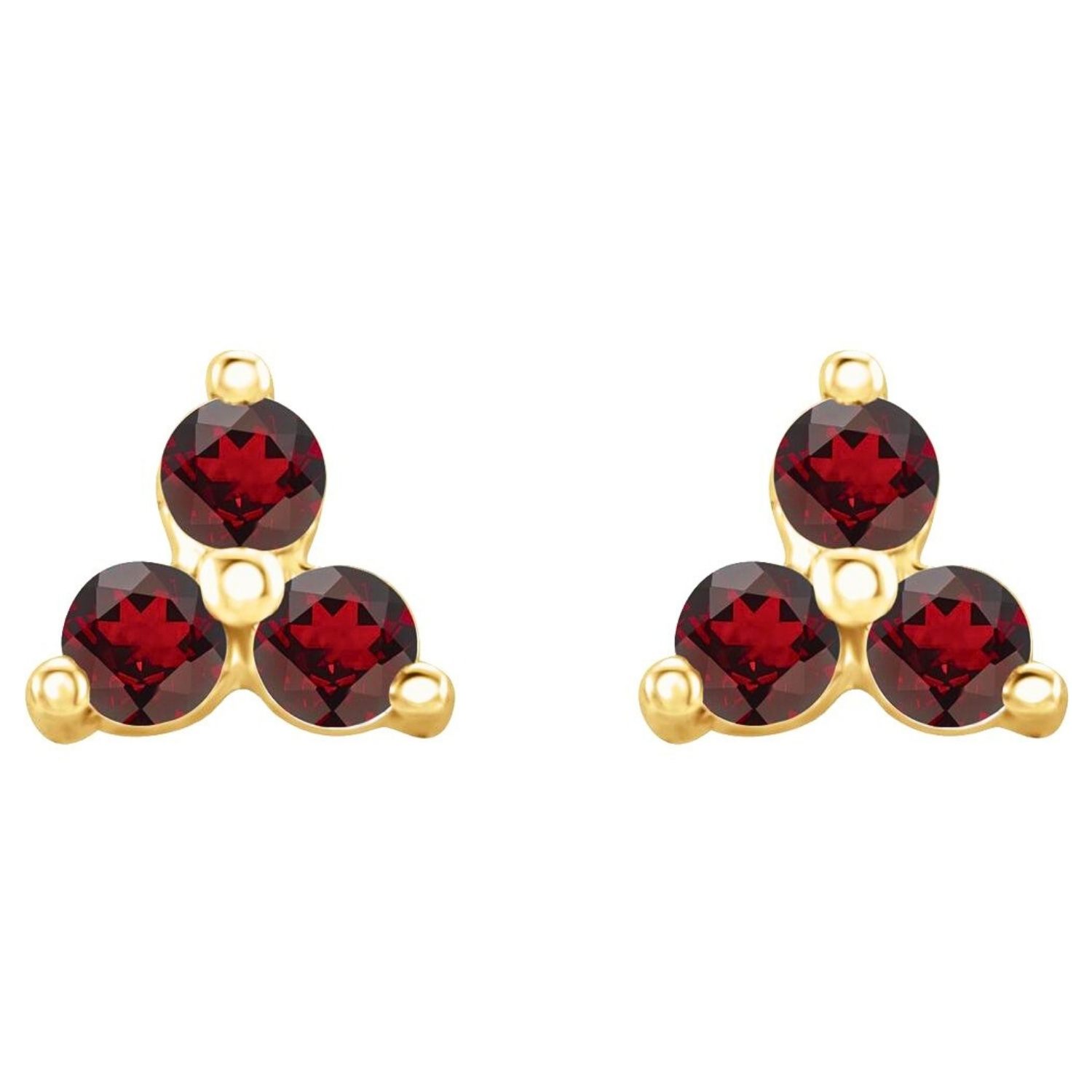Designed for women, the Red Garnet Three Stone Cluster Stud Earrings in 14K Gold feature natural garnet stones in deep red and fiery tones. Originating from Mozambique, garnet symbolizes passion and vitality and is also known as the birthstone for January. They make a powerful style statement for both everyday wear and special occasions.