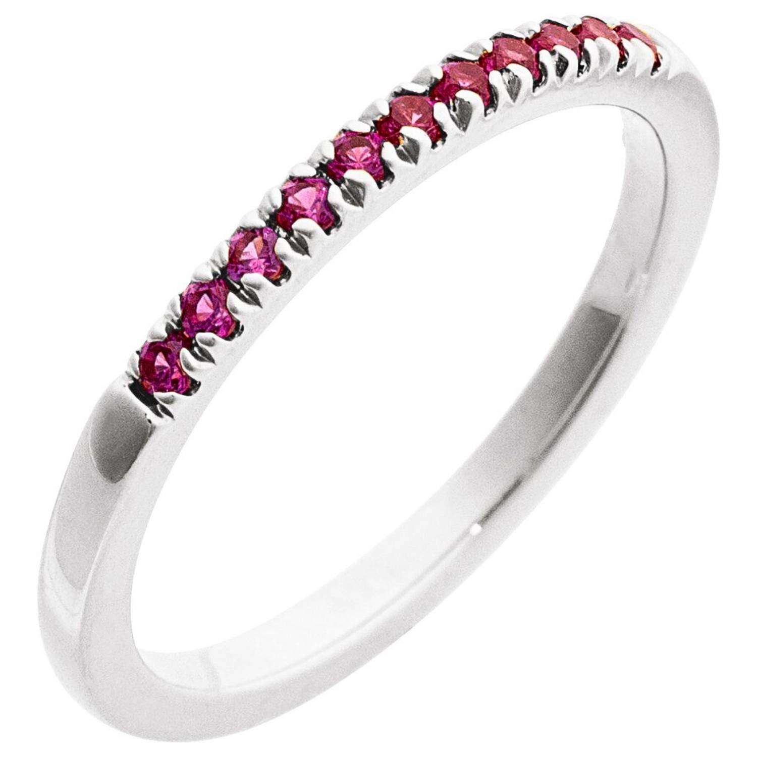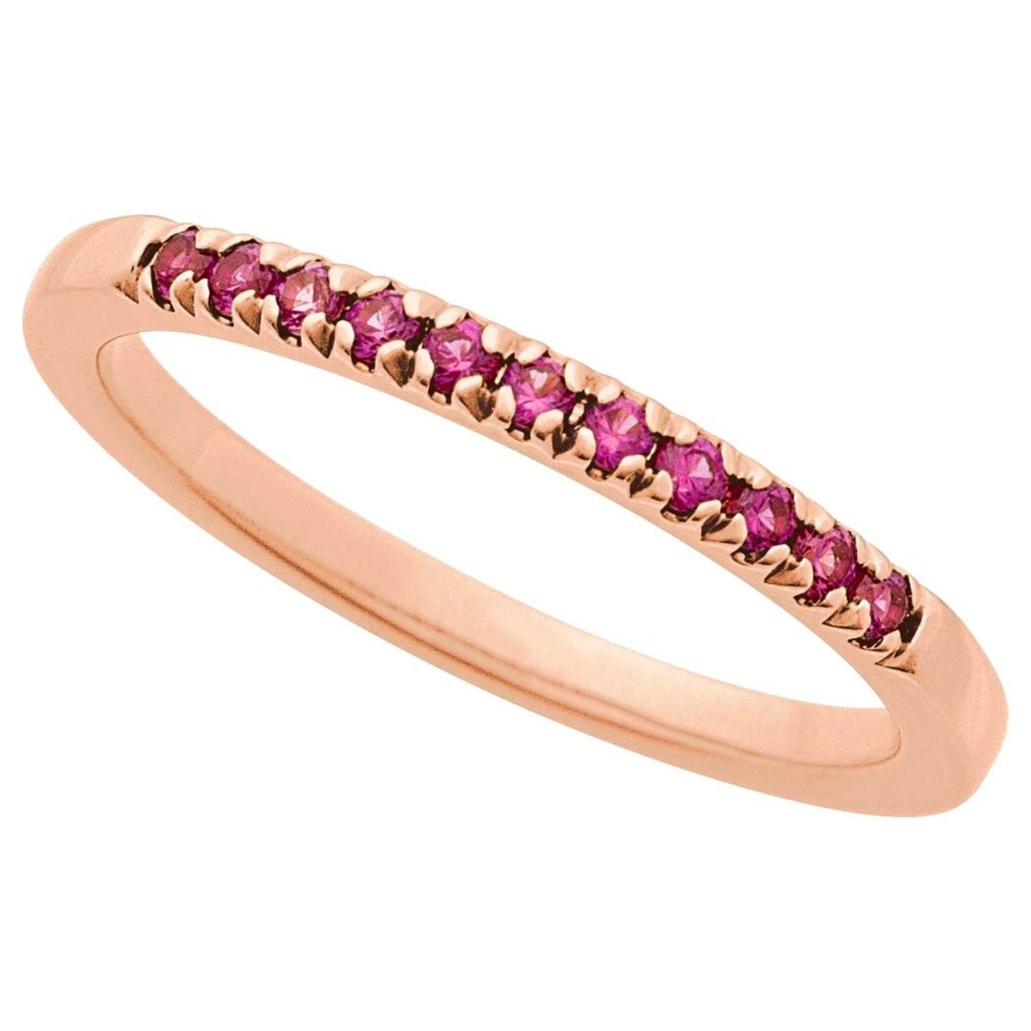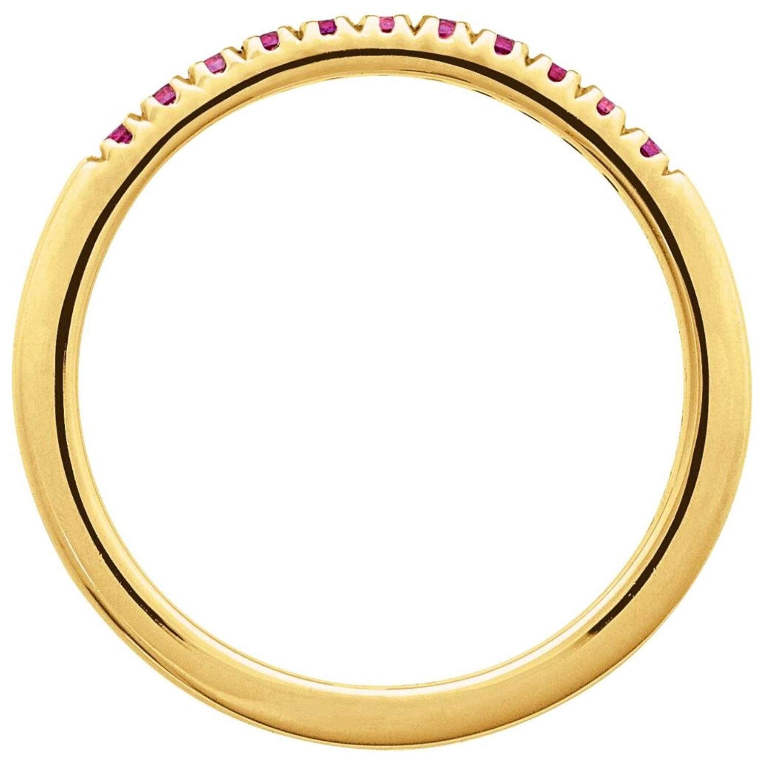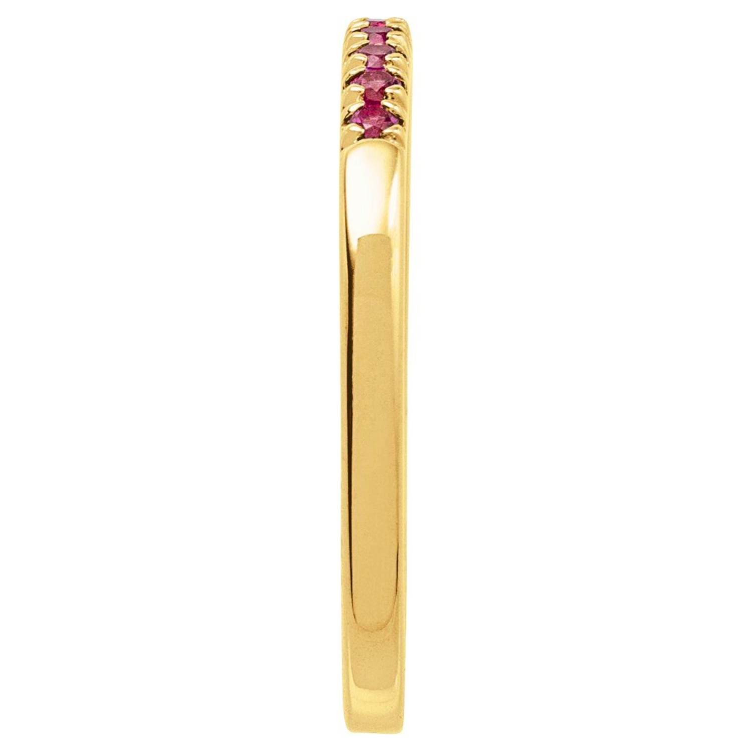Real 14K Gold Ruby July Birthstone Stackable Ring is an elegant and delicate piece of jewelry for women, suitable for everyday wear, featuring the vibrant red brilliance of natural ruby stones in a minimalist design. Worn alone, it offers simple elegance, while paired with other rings, it creates a modern stacking style. Eleven round-cut natural ruby stones accentuate their vivid color against the polished gold.