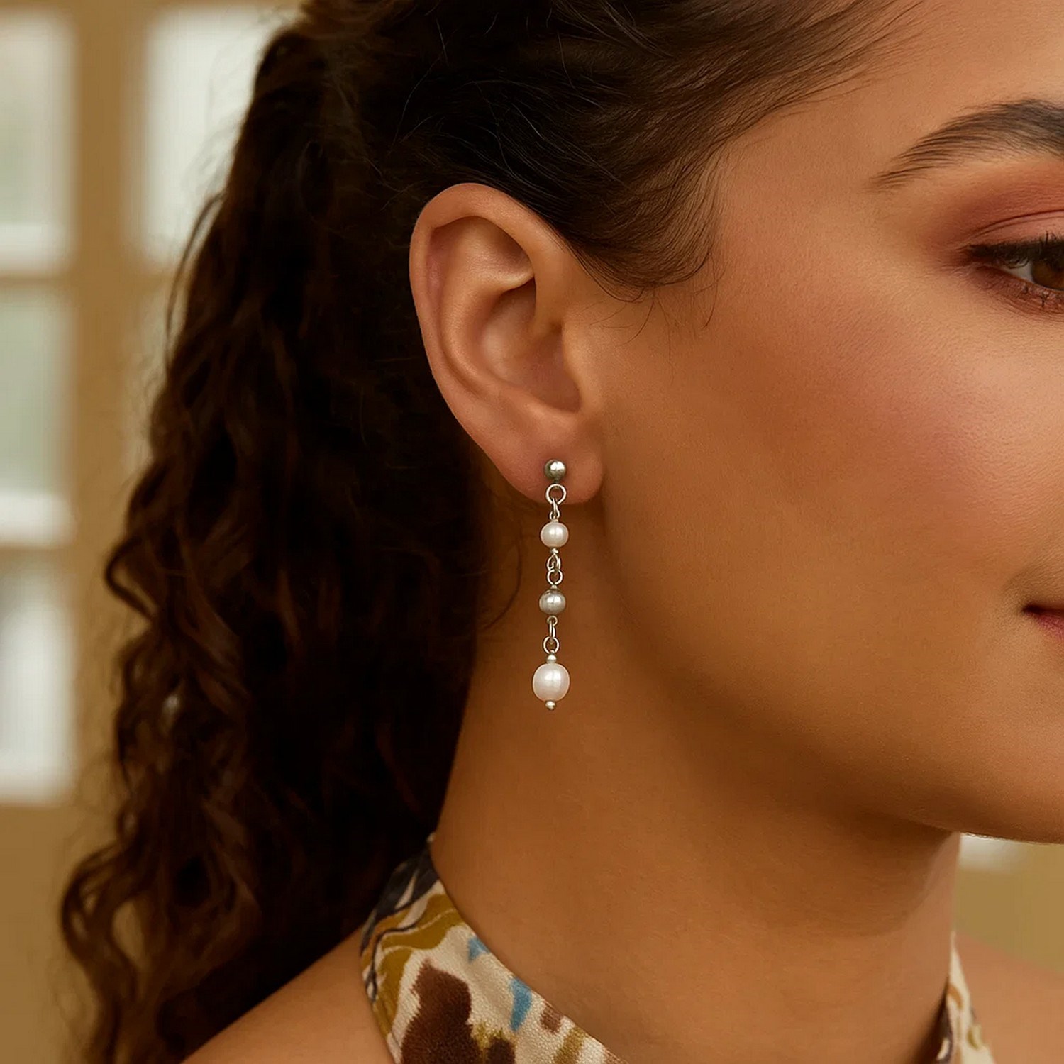 The Sterling Silver Freshwater Pearl Bead Drop Earrings stand out with their elegant and natural luster, combining the timeless beauty of pearls with a modern design. The rhodium plating applied to 925 sterling silver provides extra shine and long-lasting protection, while the sparkling freshwater pearl details add a sophisticated charm to the design. The delicate drop shape adds an elegant touch to your everyday style and offers classic elegance for special occasions.