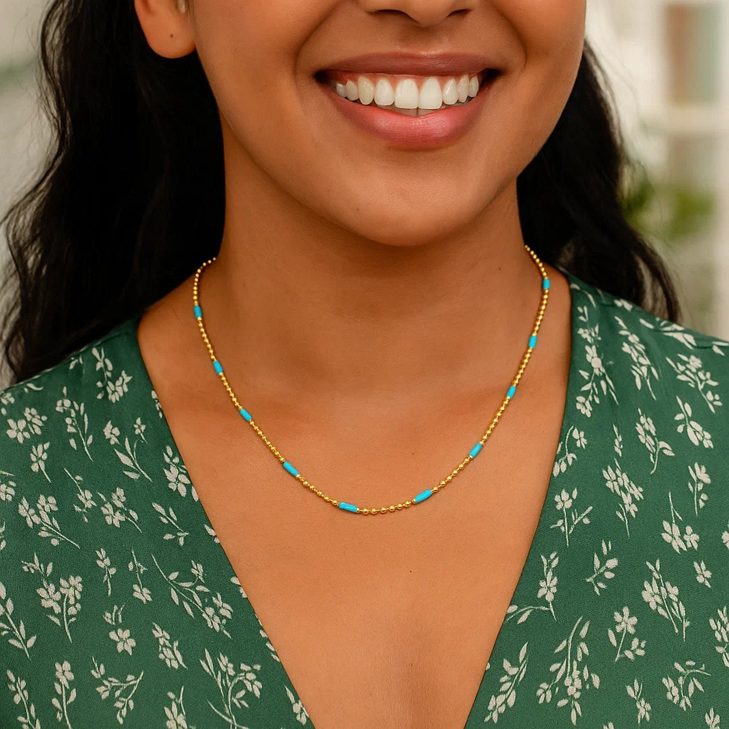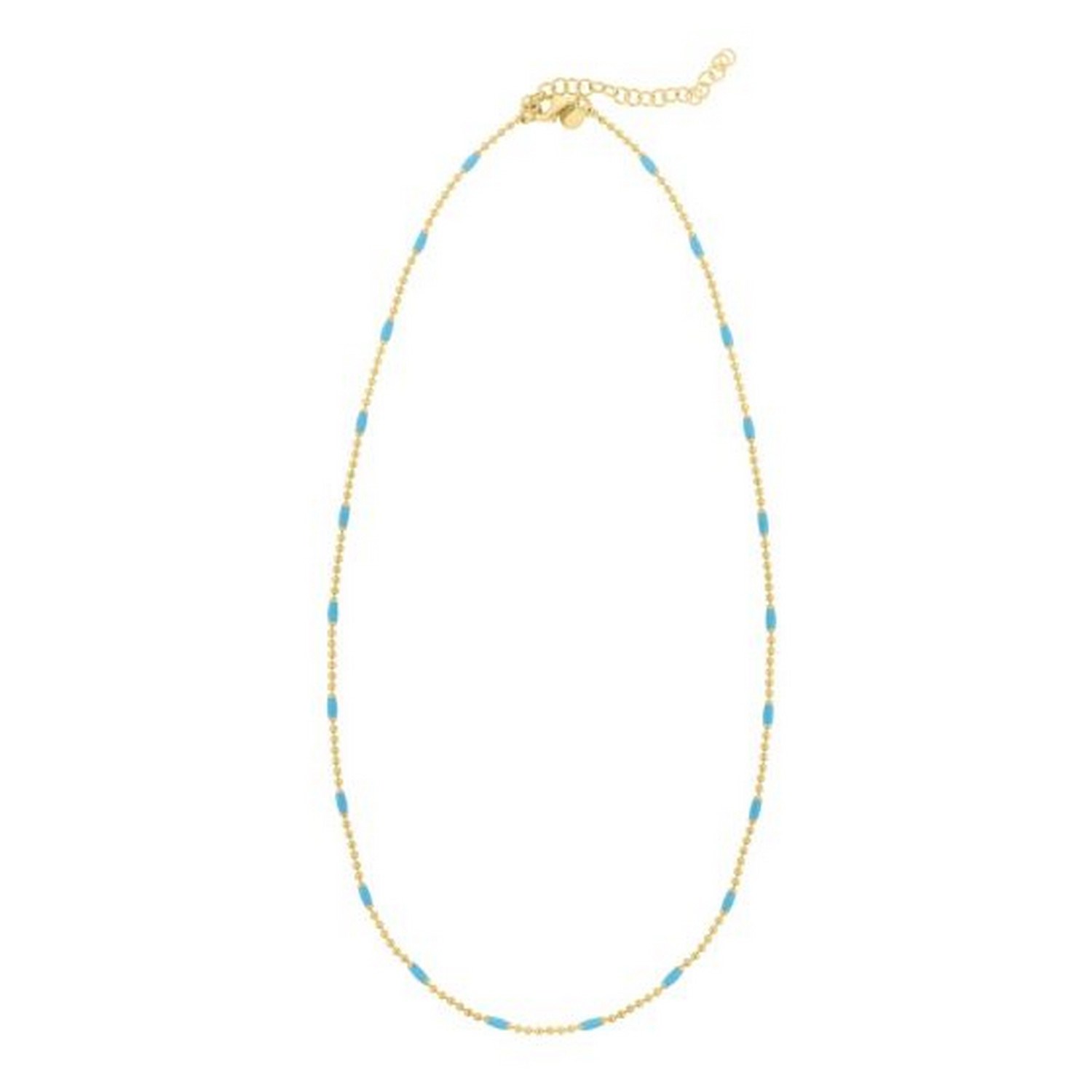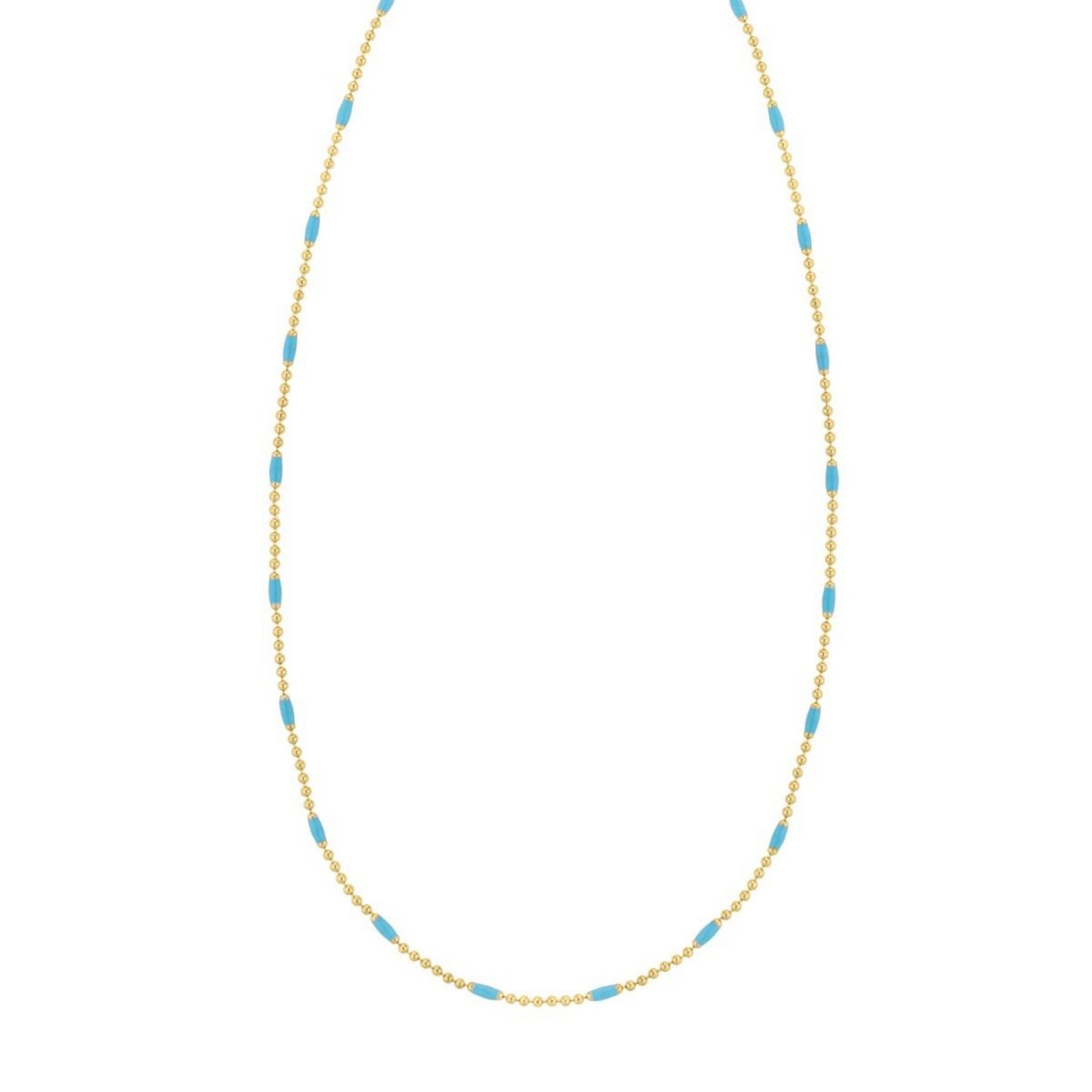 14K Gold-Plated Silver Blue Enamel Beaded Necklace offers a fresh and balanced look around the neck with its vibrant blue enamel beads and gold-plated surface. Crafted from 925 sterling silver with 14K gold plating, this necklace is lightweight for comfortable all-day wear. The blue enamel details add a splash of color to the design, while its simple form allows it to be worn alone or easily paired with other necklaces. It’s the perfect piece to liven up your everyday style or as a meaningful gift option.