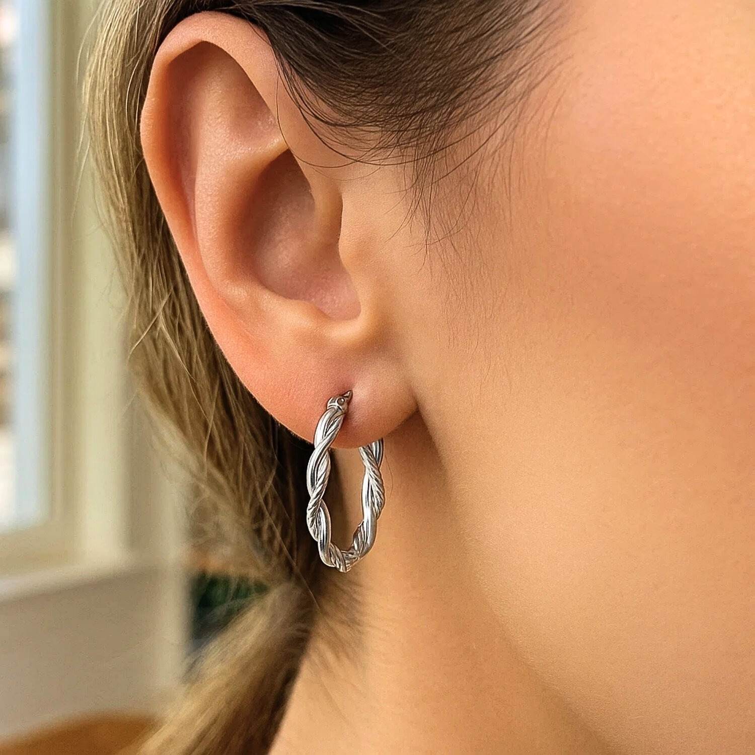 Featuring an elegant braided detail and the brilliance of a diamond cut, the Sterling Silver Oval Diamond Cut Braided Hoop Earrings are a modern take on classic hoop earrings. Crafted from genuine 925 sterling silver, these earrings maintain their shine for years thanks to their rhodium-plated surface.