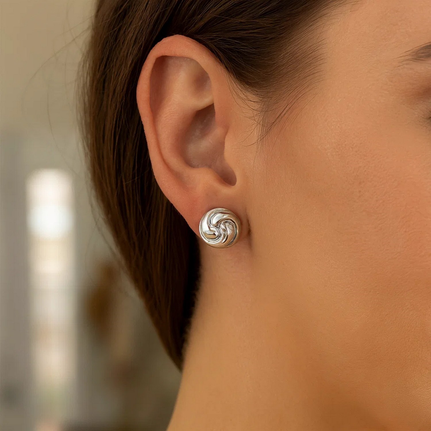 Elegant sterling silver puffed swirly knot stud earrings featuring a graceful intertwined design with a smooth, polished finish. The puffed swirls add depth and dimension, symbolizing unity and timeless style perfect for any occasion.
