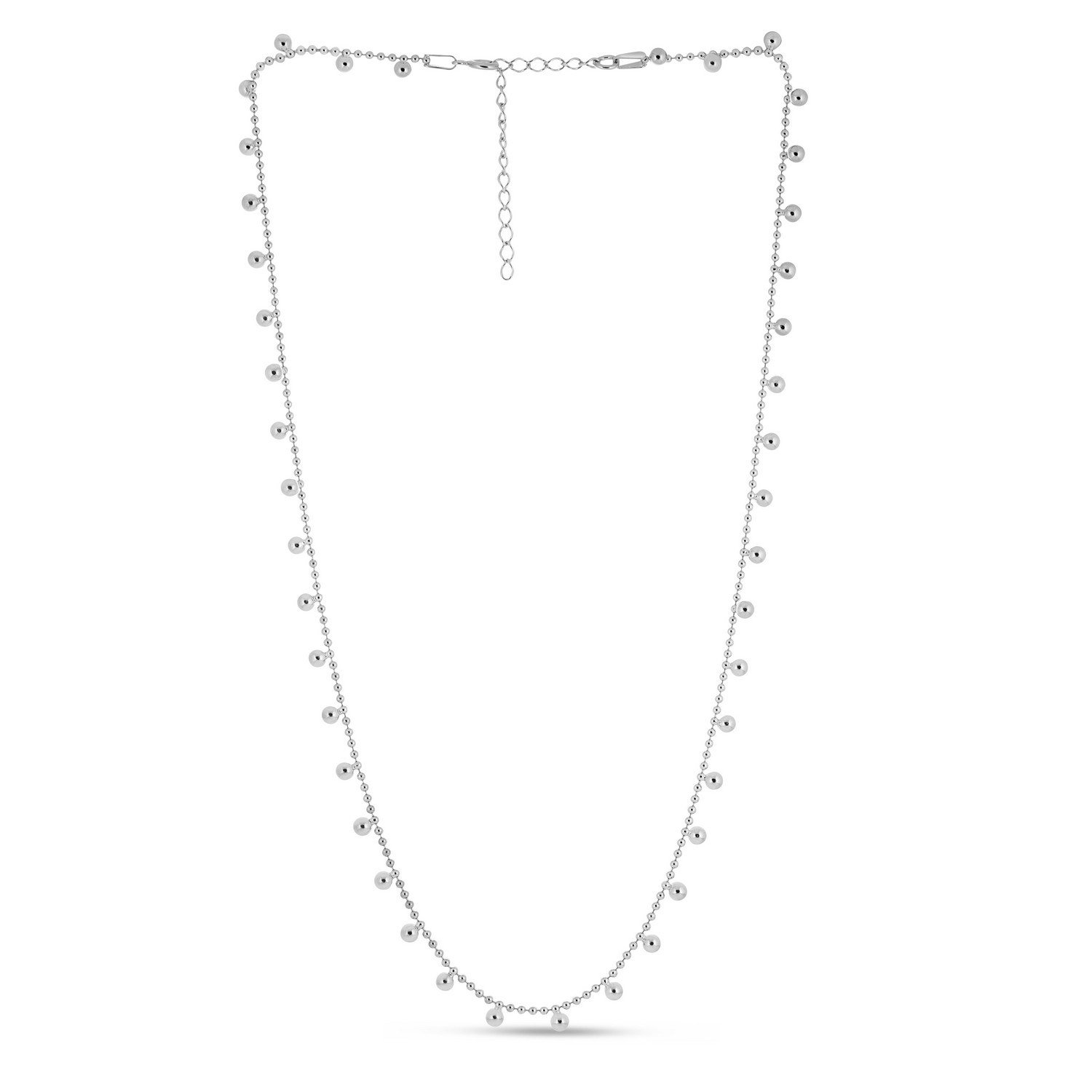 925 Sterling Silver Drop Ball Beaded Chain Necklace offers a balanced design suitable for everyday wear with its simple form and elegant proportions. Handcrafted, this necklace is finished to a fine jewelry standard. Its lightweight construction ensures comfortable all-day wear around the neck. The 925 sterling silver construction is hypoallergenic and tarnish-resistant, maintaining its shine for a long time. The shiny round beads and rhodium-plated chain offer a modern and stylish look. While elegant on its own, it easily complements layered combinations with other necklaces. It can be chosen for special occasions or as a gift.
