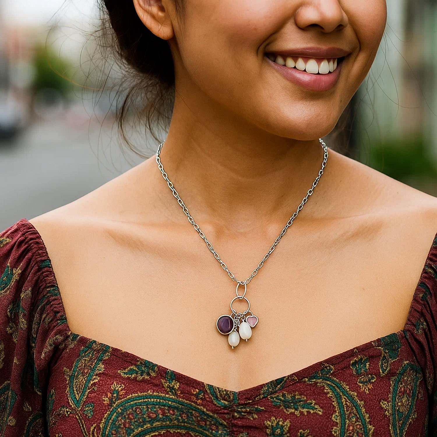925 Sterling Silver Purple & Pink Cubic Zirconia Pearl Bead Charm Necklace offers an elegant and balanced design crafted with fine jewelry quality. The charm detail features a pink cubic zirconia stone in a heart shape and a purple cubic zirconia stone in a circle shape, giving the necklace a colorful yet harmonious contrast. The pearl bead detail softens the design while adding a feminine and balanced character to the necklace. Thanks to its rhodium-plated 925 sterling silver construction, it retains its durability for a long time, is hypoallergenic, and does not tarnish. Suitable for everyday wear, it stands out as a simple accent on its own or can be easily combined with other necklaces. It is a unique piece of jewelry that can be presented as a luxurious and stylish gift for Valentine’s Day, birthdays, or other special occasions.
