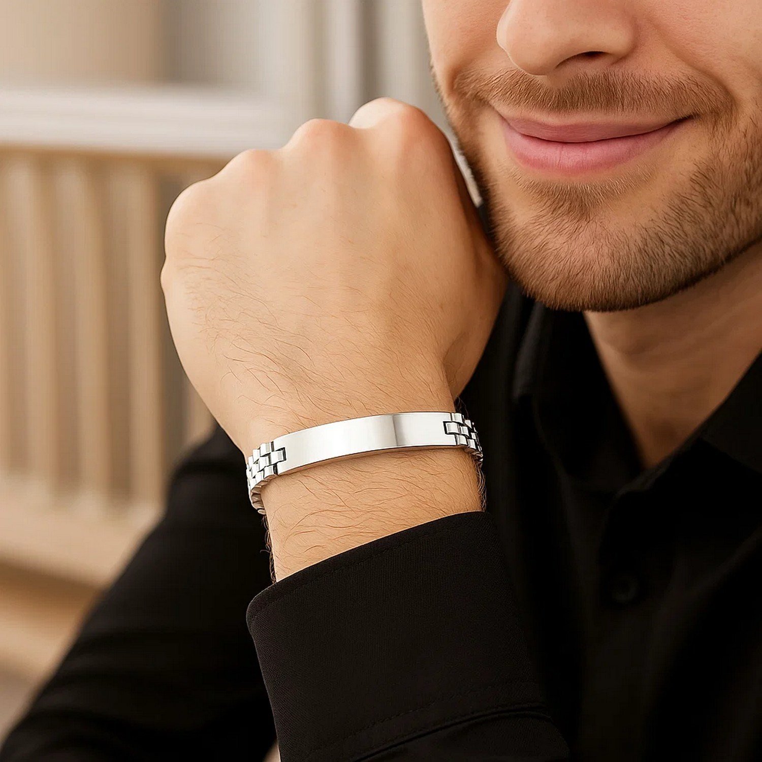 Crafted from 925 sterling silver, the Sterling Silver Railroad Chain ID Bracelet is a unique design that stands out with its strong and modern look. Its rhodium-plated coating ensures it retains its shine for a long time, does not tarnish, and offers durability suitable for everyday use. Its hypoallergenic composition allows for comfortable wear on sensitive skin. The railroad chain texture gives the bracelet a unique depth and character, while the smooth ID plate offers a modern and simple elegance. This model easily complements your everyday style and creates a strong style statement even when worn alone.