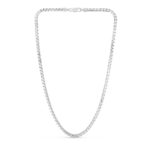 With its bold and striking design, the Sterling Silver Rockstar Cut 4mm Round Box Chain Necklace is a delicate piece of jewelry crafted from 925 sterling silver with a rhodium plating. The 4 mm thick rockstar cut round box chain offers eye-catching sparkle by reflecting light from every angle thanks to its faceted links. Its tarnish-resistant and hypoallergenic properties make it suitable for everyday wear; its handcrafted details and durable construction create a standout style when worn alone or paired with your favorite necklace.