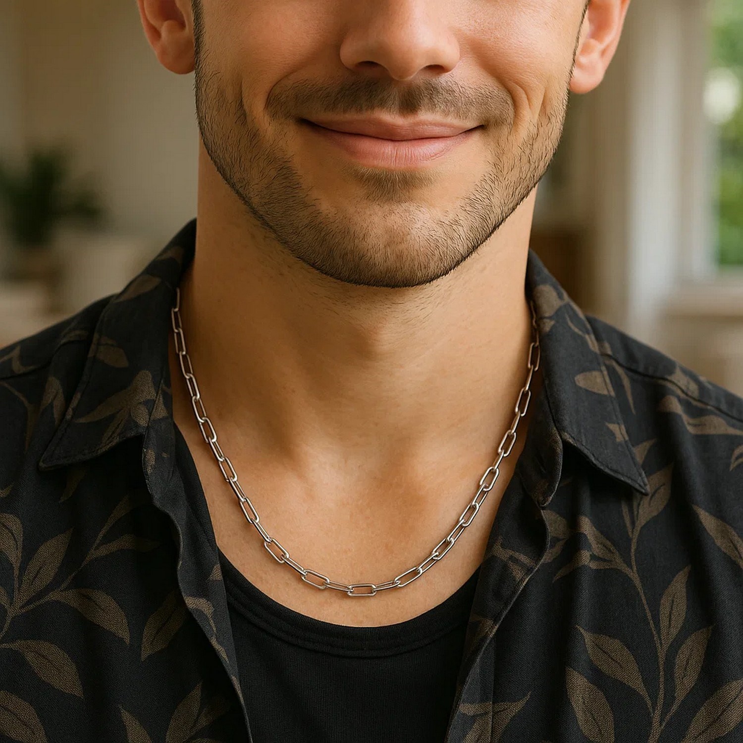 Sterling Silver Round Link 4mm Paperclip Chain Necklace, crafted with fine jewelry quality, is a tarnish-resistant and hypoallergenic chain. It is suitable for everyday wear and offers a light, comfortable fit around the neck. The 4 mm thick round link design provides a modern and stylish look, both on its own and when combined with a pendant.