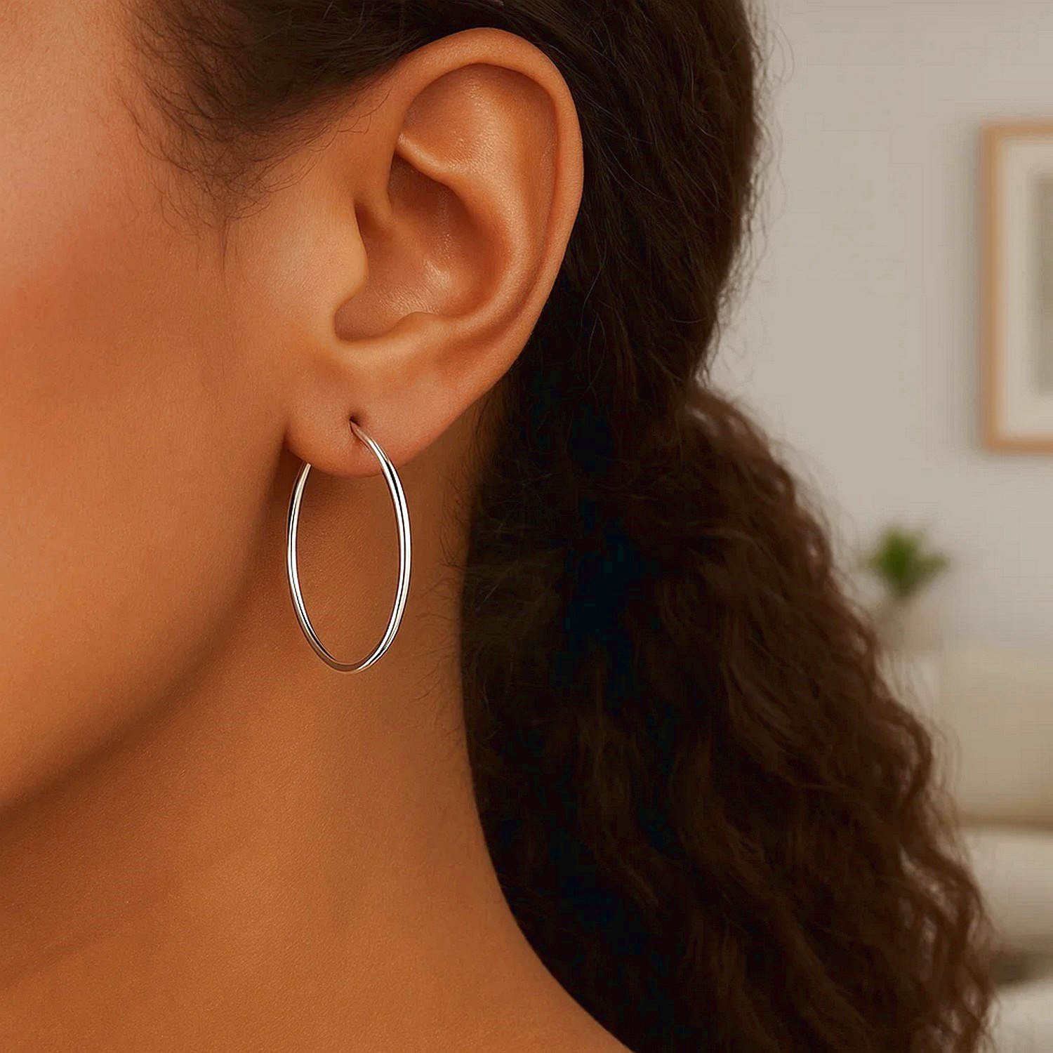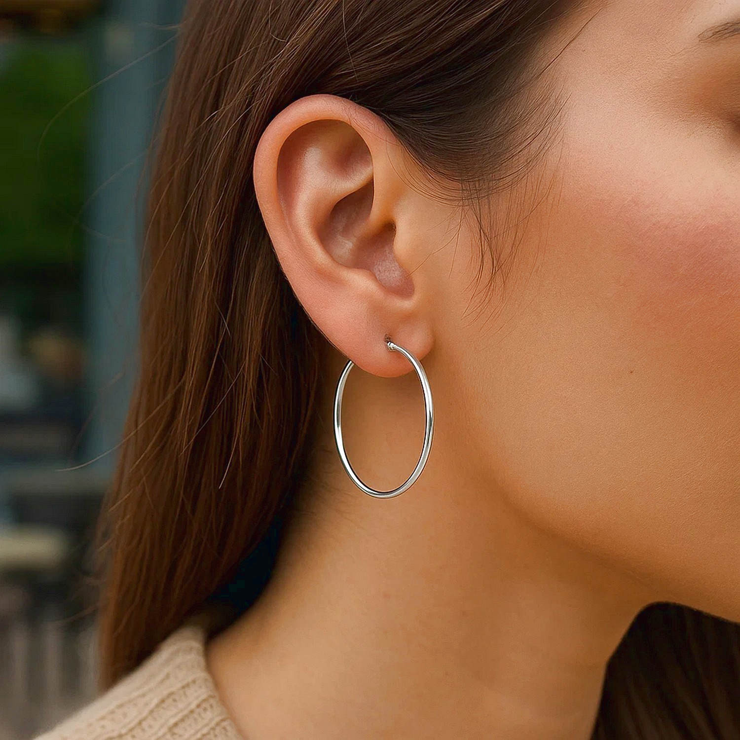 925 Sterling Silver 2mm x 40mm Hoop Earrings, with their elegant form and modern look, are a must-have piece for any jewelry collection. They are the perfect choice for adding a touch of elegance to your everyday style or achieving a classic look for special occasions. Order online now and don’t miss out on free shipping and special discounts.er hoops to your jewelry box today for a fresh, easy-to-style accessory you’ll reach for again and again.