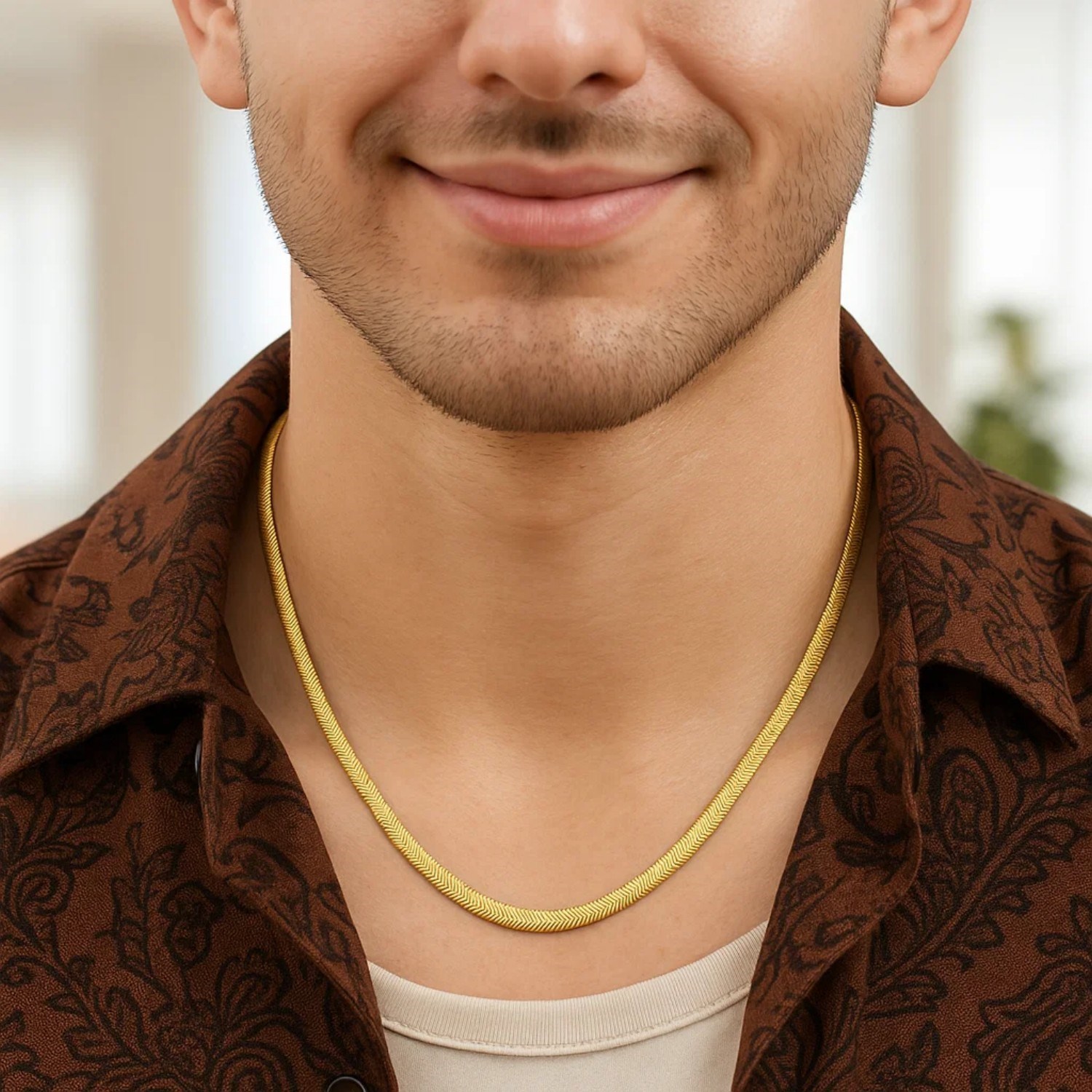 The Yellow Gold-Plated Sterling Silver Oval Snake Chain 4.2mm is a fine jewelry-quality chain that is tarnish-resistant and hypoallergenic. Its 4.2mm oval snake design, featuring long, smooth links, provides a comfortable and balanced fit around the neck. The warm gold-plated tone and shiny surface make the chain a striking piece even when worn alone. Suitable for everyday wear, it becomes a stylish accessory when combined with different pendant ends. It is an ideal choice both for yourself and for those looking for a gift.