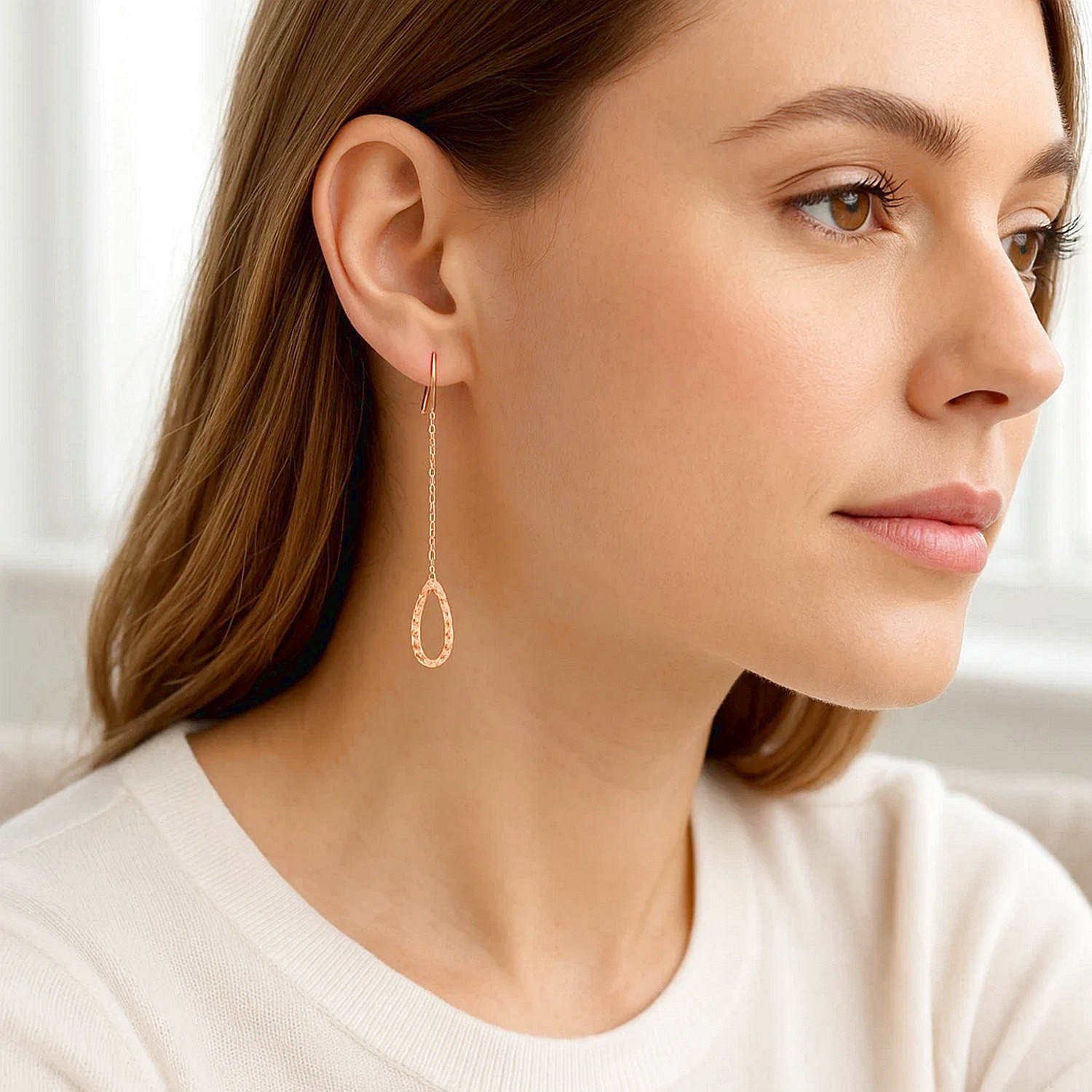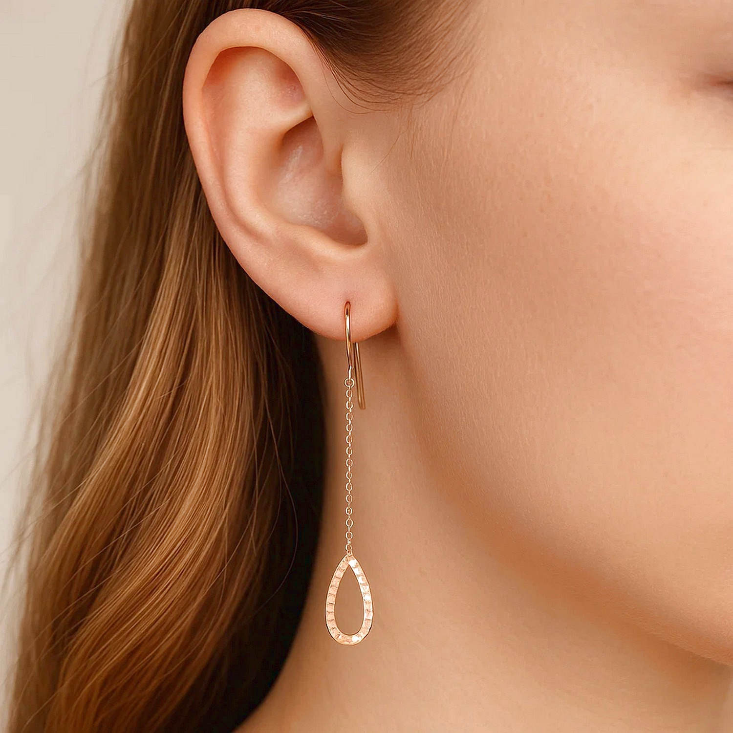Real 14K Rose Gold Textured Open Pear Shaped Long Chain Dangle Drop Earrings feature a unique design that combines simple elegance and fine craftsmanship. They add a touch of elegance to everyday wear and serve as a striking accessory for special occasions. The soft glow of rose gold and the textured surface add a touch of sophistication to any style. Order online now and don’t miss out on free shipping and special discounts.